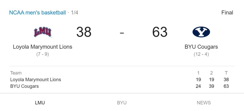BYU is getting hot at the right time. They’ve won their last 4 games by an average of 18.5 points, including an 85-54 smashing at Portland (the Trailblazers?). On the other end of the court, Loyola Marymount (LMU) is having a horrific season. At 8-16 (2-8), and losing 8 of their last 9, LMU can’t do anything right. The defense is actually alright, but their offense just can’t score to save their life. LMU has only broken 70 points twice since unwrapping gifts on Christmas. Apparently a good jumper wasn’t one of the presents. The last thing I’ll contribute about this matchup is this from their last meeting.
